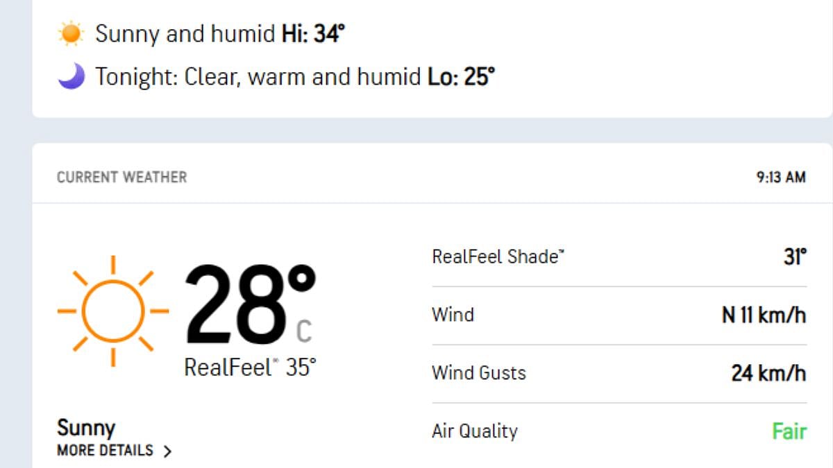 Mumbai: The city wakes up to sunny and humid weather with light winds on Monday morning, with noticeably improved air quality. The temperature at 9 am was recorded at 28 degrees Celsius, with maximum temperature expected to reach 34 degrees Celsius today, according to Accuweather.com.