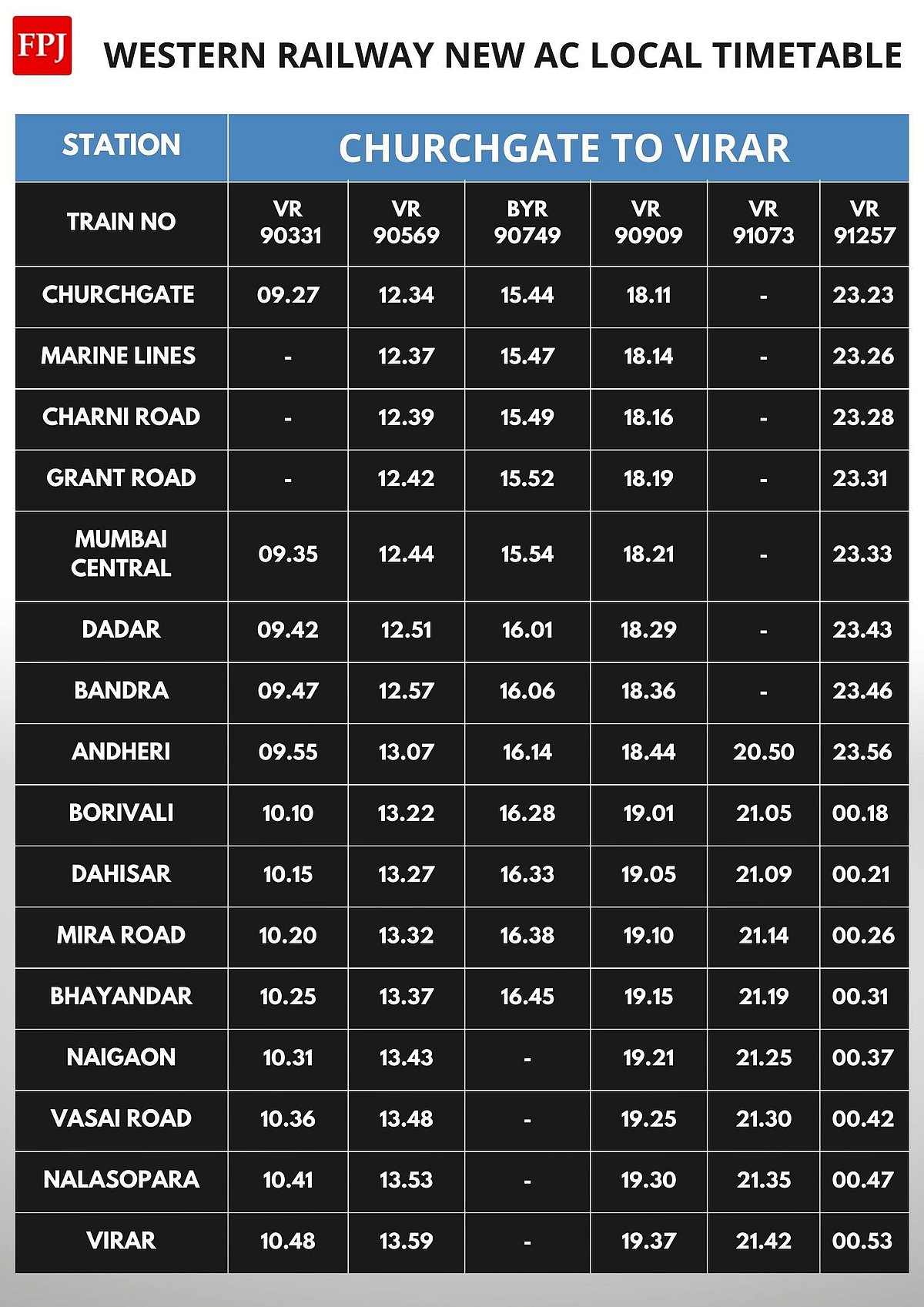 The Western Railway of Mumbai Division today announced the new timetable for the additional AC local trains that will run from Virar to Churchgate and back.