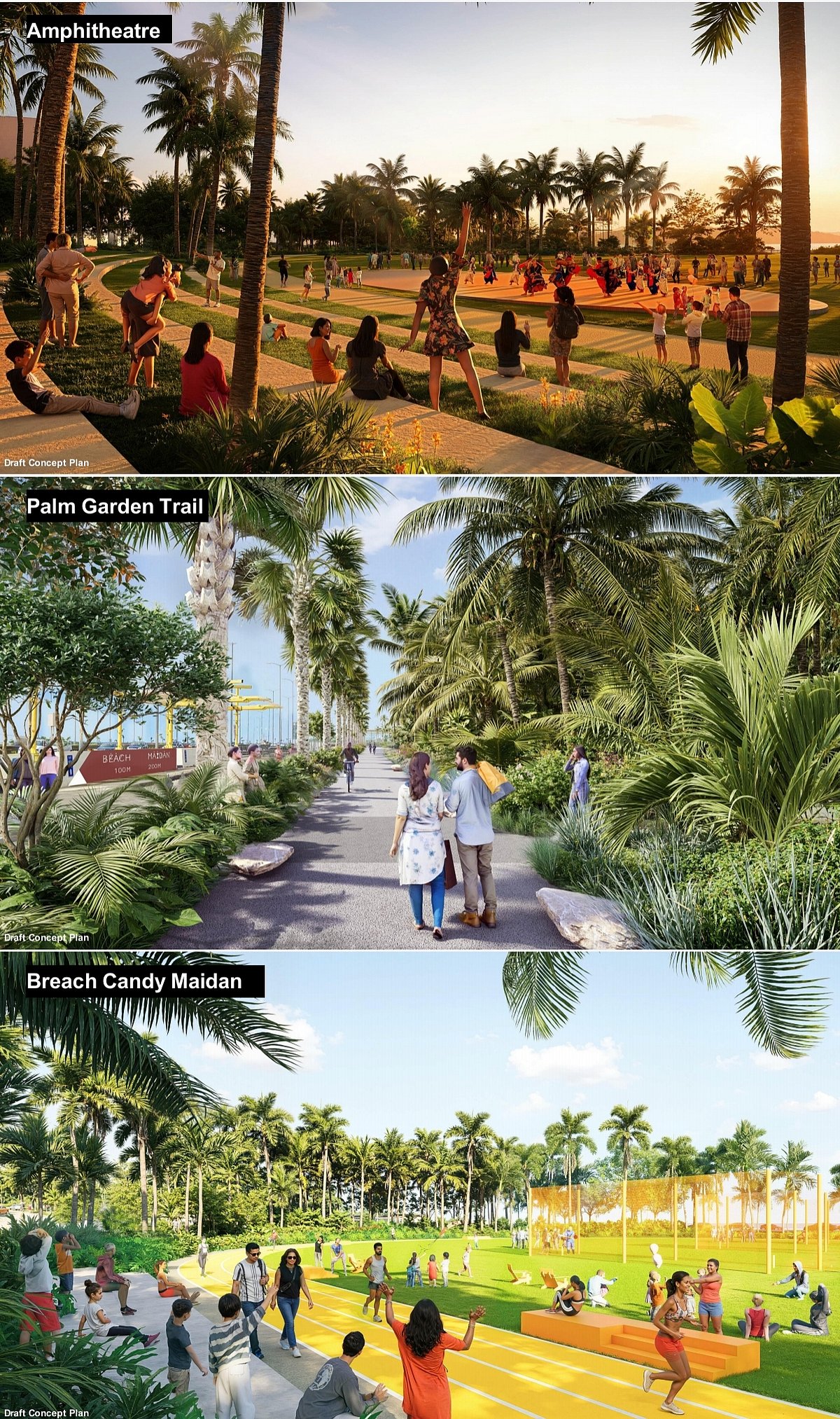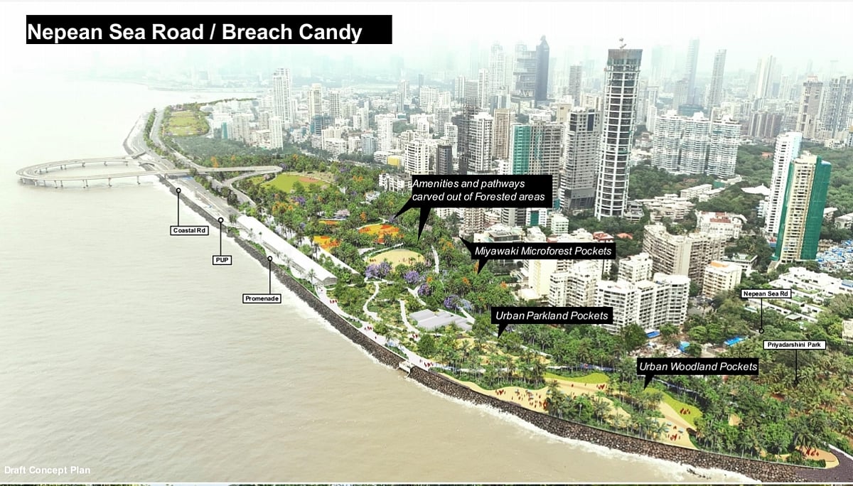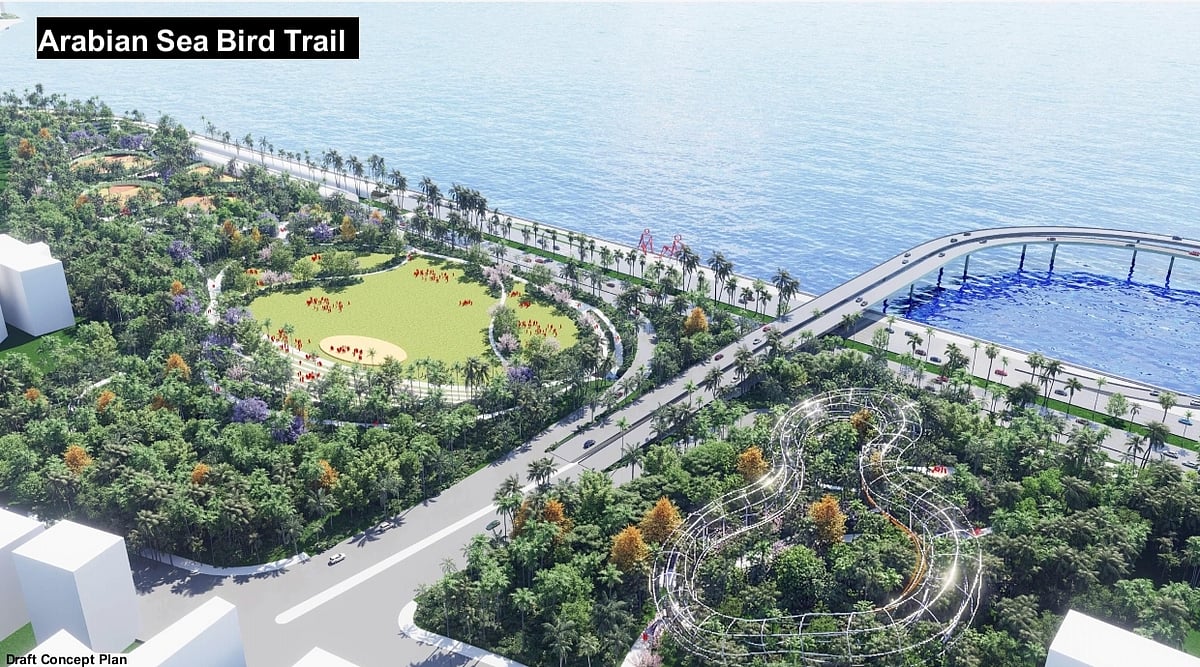 The 28-pagea draft concept plan of the Coastal Road Garden calls the project a New Iconic Public Realm for Mumbai and states that the master plan maximises the forest-like areas with 55% reclaimed land dedicated to forests, woodlands and gardens, at par and in some cases exceeds other world class water front parks.