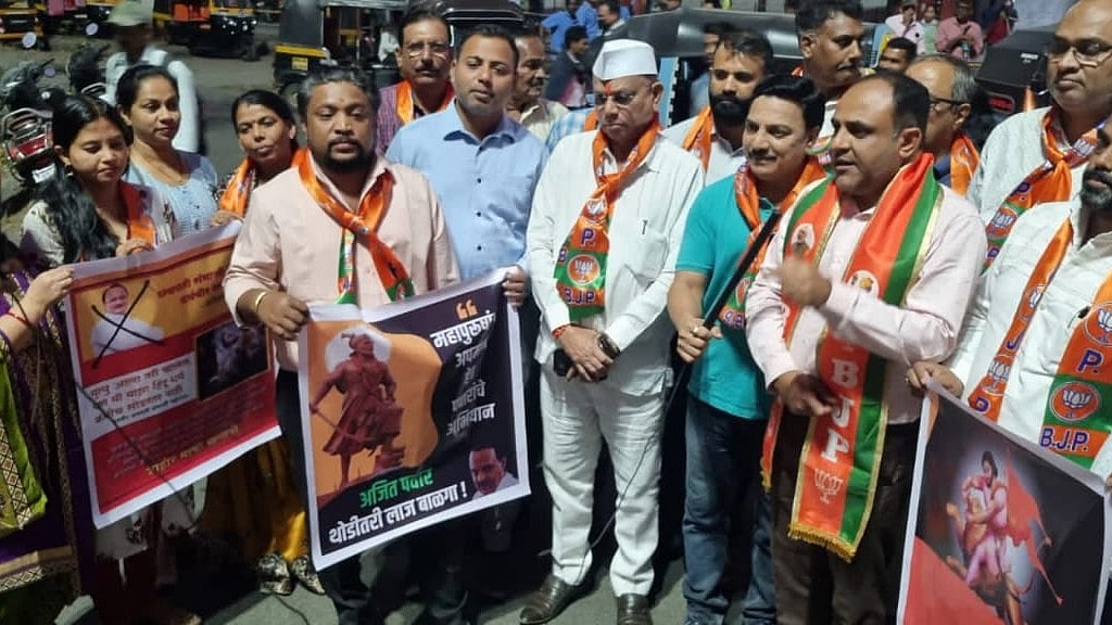 Navi Mumbai: The Kharghar BJP staged a protest against opposition leader Ajit Pawar over his statement on Chhatrapati Sambhaji Maharaj during Nagpur Legislature Session on Friday.