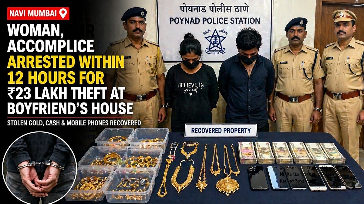 Navi Mumbai, April 21: A 29-year-old woman and her accomplice were arrested for a theft in her boyfriend's house. The arrest was made within 12 hours of a theft case being registered by Poynad Police, with officers recovering stolen valuables worth Rs 23.05 lakh, including gold jewellery, cash and mobile phones.