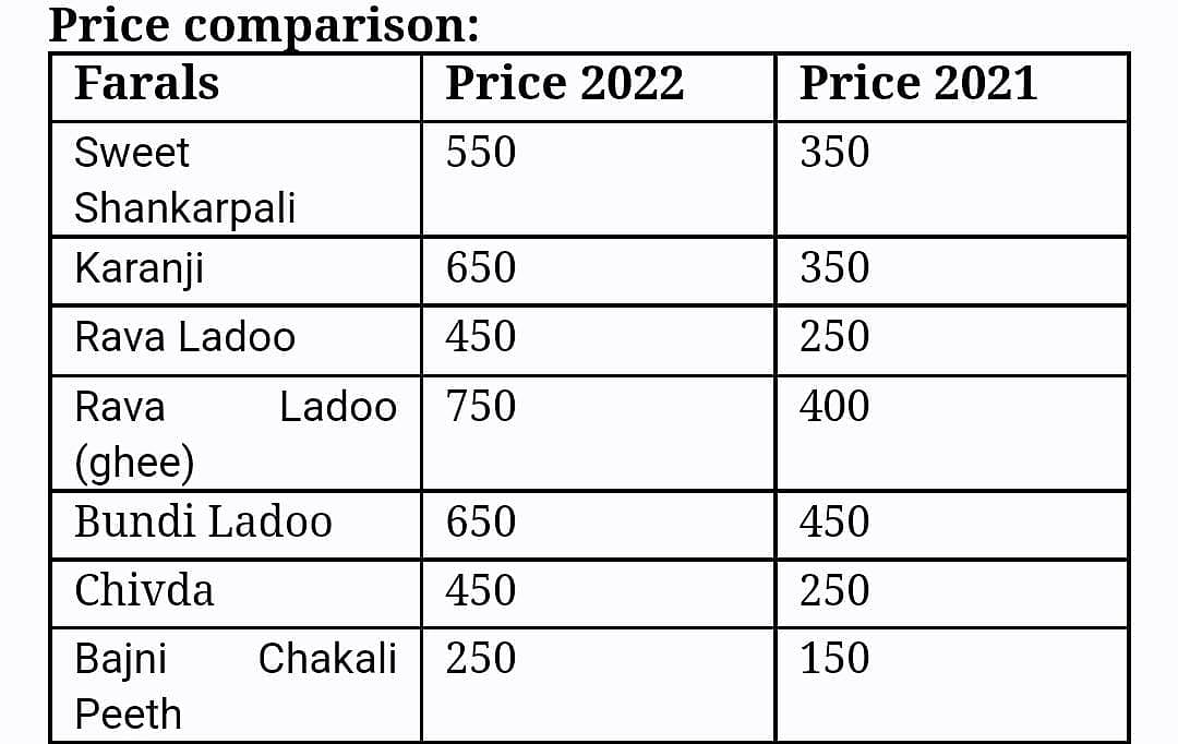As oil is one of the major ingredients for making farals like chivda, shankarpali, karanji, chakali and others, the cascading effect of oil price hike is being seen this year.