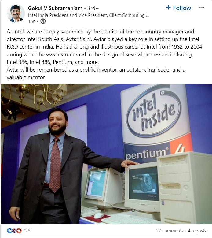 The current president of Intel India, Gokul V Subramanian, took to social to and condoled Saini's death, "At Intel, we are saddened by the demise of former country manager & director Intel South Asia, Avtar Saini. Avtar played a key role in setting up Intel R&D center in India."
