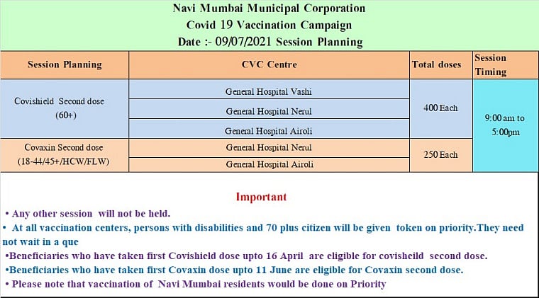 Navi Mumbai Municipal Corporation (NMMC) issued a list of COVID-19 vaccination centres for beneficiaries on July 9. The vaccination centres shall be open for those who want to take second dose of Covaxin and Covishield. No first doses of both the vaccines shall be administered.