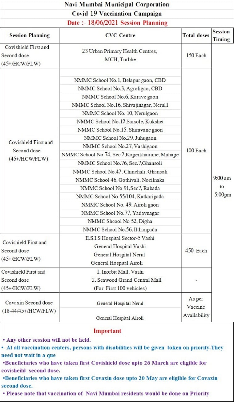 Navi Mumbai Municipal Corporation (NMMC) issued a list of COVID-19 vaccination centres for beneficiaries on June 18. The vaccination centres shall be open for those who want to take both the doses of Covishield while only second dose of Covaxin shall be administered at one centre only.