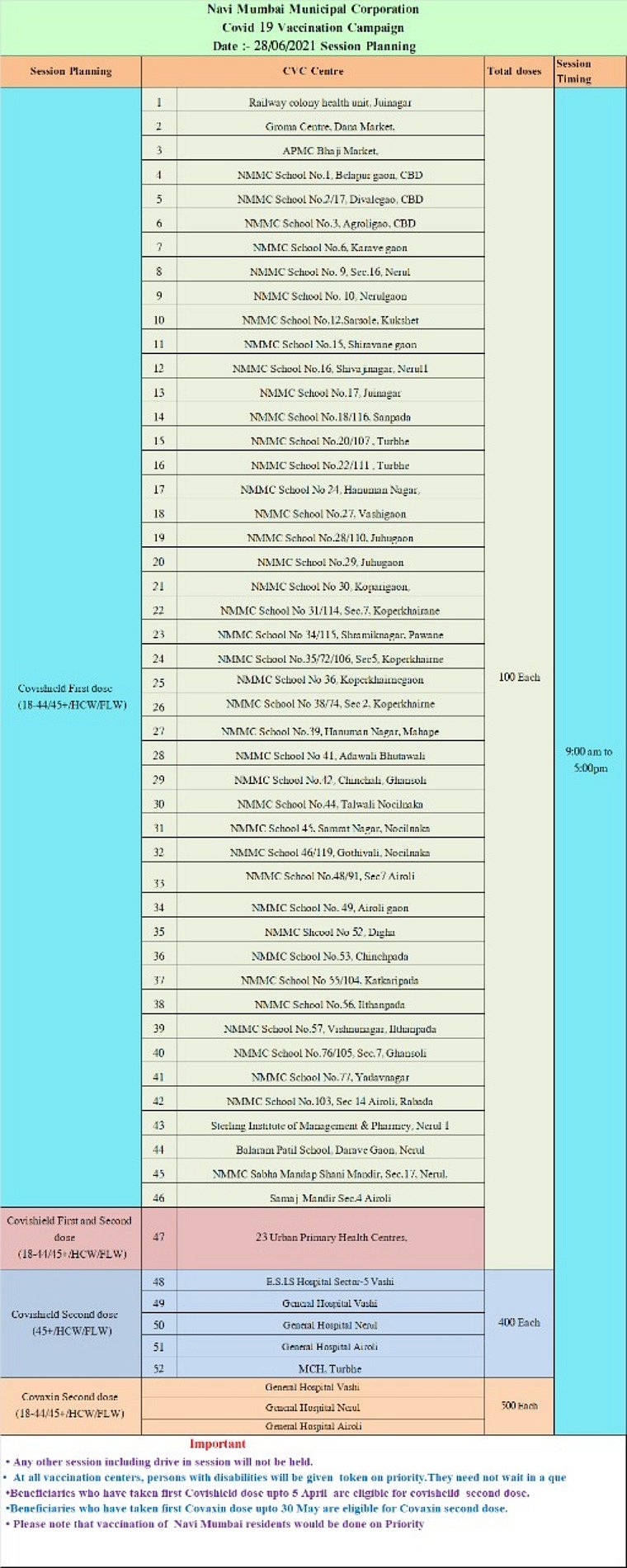 Navi Mumbai Municipal Corporation (NMMC) issued a list of COVID-19 vaccination centres for beneficiaries on June 28. The vaccination centres shall be open for those who want to take both the doses of Covishield while only second dose of Covaxin shall be administered.