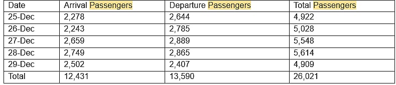 In five days, the airport recorded a total of 26,021 passenger movements and managed 162 scheduled air traffic movements, comprising 81 arrivals and 81 departures.