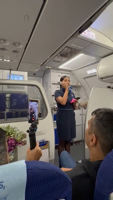Akasa Air crew also celebrated the first landing at NMIA by posing for pictures with cutout reading, "The Akasa Experience."