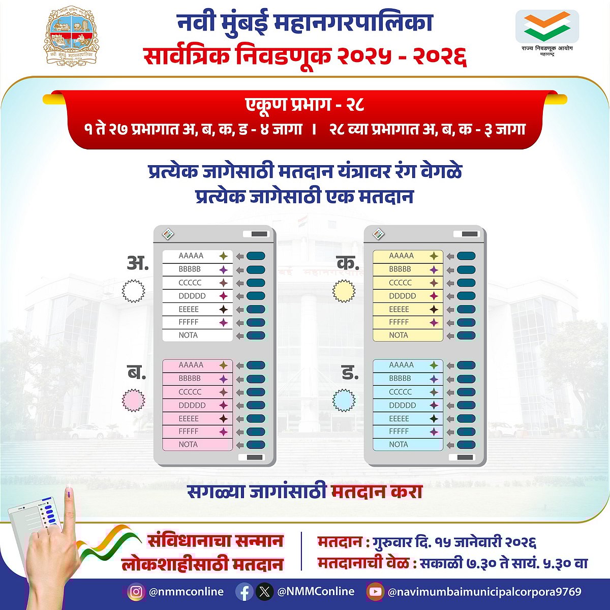 Under the panel system, each ward will elect more than one corporator. Of the 28 wards in Navi Mumbai, wards 1 to 27 will elect four corporators each—designated as seats ‘A’, ‘B’, ‘C’ and ‘D’—while ward number 28 will elect three corporators for seats ‘A’, ‘B’ and ‘C’. Accordingly, voters will be required to cast one vote for each seat in their ward.