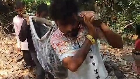 Thane: In a stark reflection of the deep infrastructural gaps in Maharashtra’s tribal belt, a critically ill woman from Varsavadi village in Shahapur taluka was carried in a makeshift cloth doli across rugged terrain to reach medical care as the village remains cut off from any motorable road.