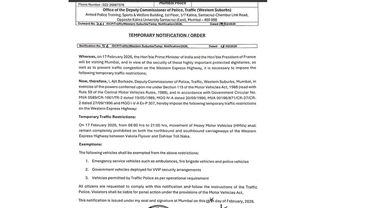 As per the order, a stretch of Chhatrapati Shivaji Maharaj Marg, from Shyama Prasad Mukherjee Chowk (Regal Junction), will remain closed to all vehicular traffic except emergency vehicles. Similarly, P. Ramchandani Marg, from Jokhim Alva Chowk (North Court) to Adam Street Junction, will also be shut for general traffic during the notified hours. Moreover, several roads, including Nathalal Parekh Road, Jagannath Bhosale Road, Captain Prakash Pethe Road, Rambhau Salgaonkar Road, Shahid Bhagat Singh Road, and B.K. Boman Behram Marg, particularly the stretch behind the Taj Hotel up to Hotel Diplomat have been declared as no-parking zone.