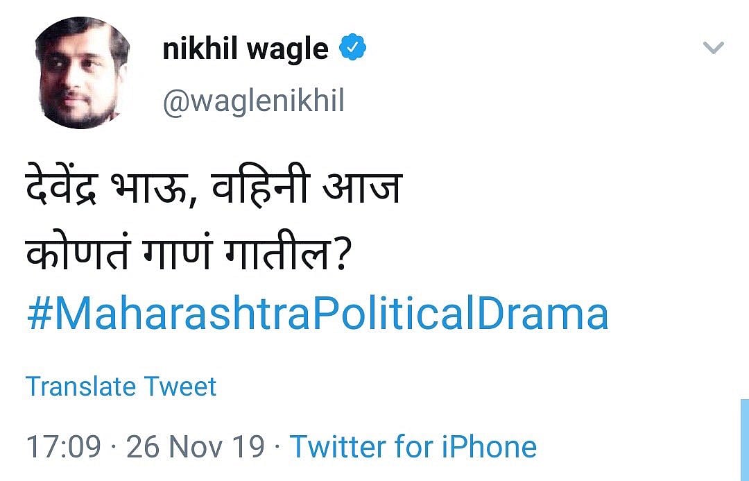 After Devendra Fadnavis' resignation from the post of Chief Minister wherein he lasted for only 3 days and 8 hours, journalist Nikhil Wagle tweeted, "Which song will sister-in-law sing today, Devendra brother?"