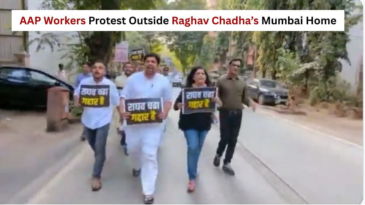 The protest comes after Chadha announced his resignation from the AAP and formally aligned himself with the BJP, triggering sharp reactions within the party.