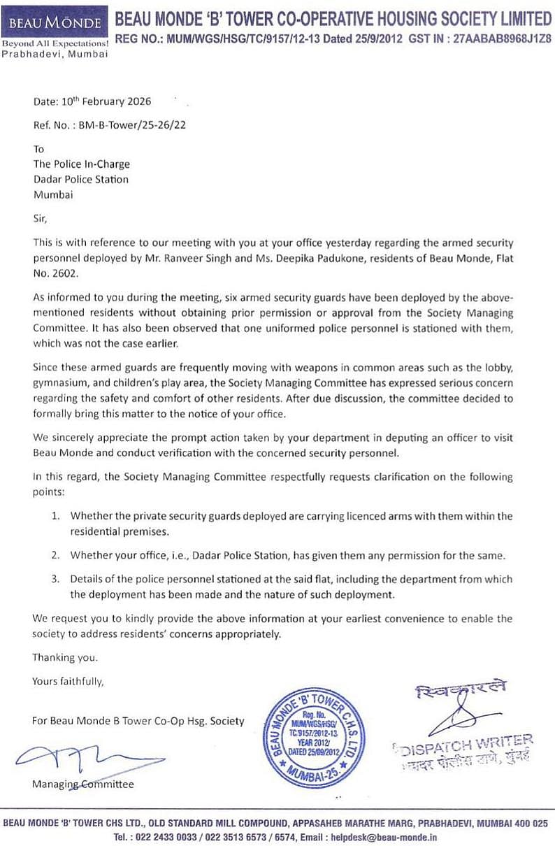 The society has submitted a formal letter to Dadar Police Station, stating that the armed guards were deployed without prior permission or approval from the Society Managing Committee. Beau Monde Housing Society’s letter sent to Dadar Police has been accessed by FPJ.
