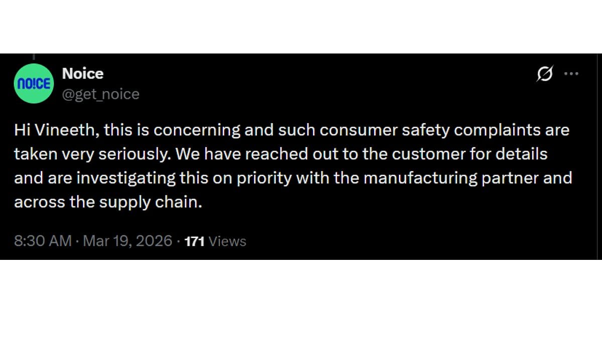 Replying to the post, NOICE said the incident is very concerning and that consumer safety is a top priority. Moreover, it added that they contacted the customer for more details and are also conducting a priority investigation with its manufacturing partner and across the supply chain.