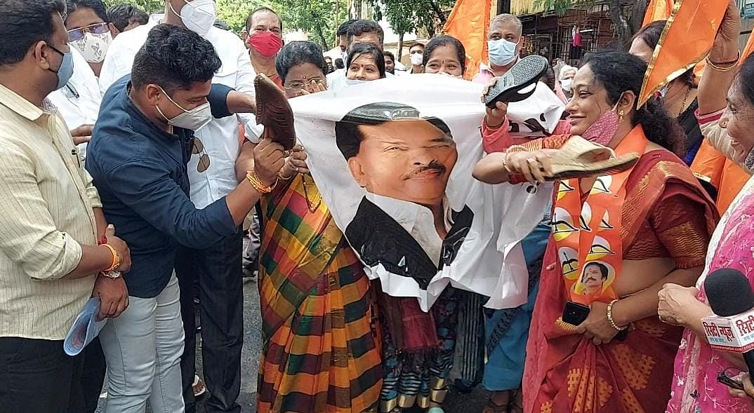 Shouting slogans against Rane, the Sena protesters beat his posters with slippers and sandals outside the Shiv-Sena shakha in Bhayandar.