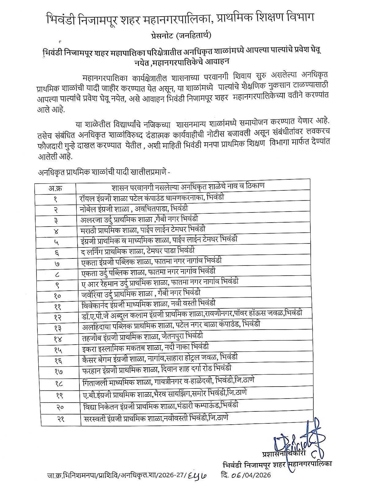 Bhiwandi, April 10: The number of unauthorized schools operating within the Bhiwandi Nizampur Municipal Corporation (BNMC) limits has risen this year, triggering serious concerns over regulatory enforcement and student safety. According to the civic education department, a total of 21 illegal schools have been identified—an increase from 18 reported last year.