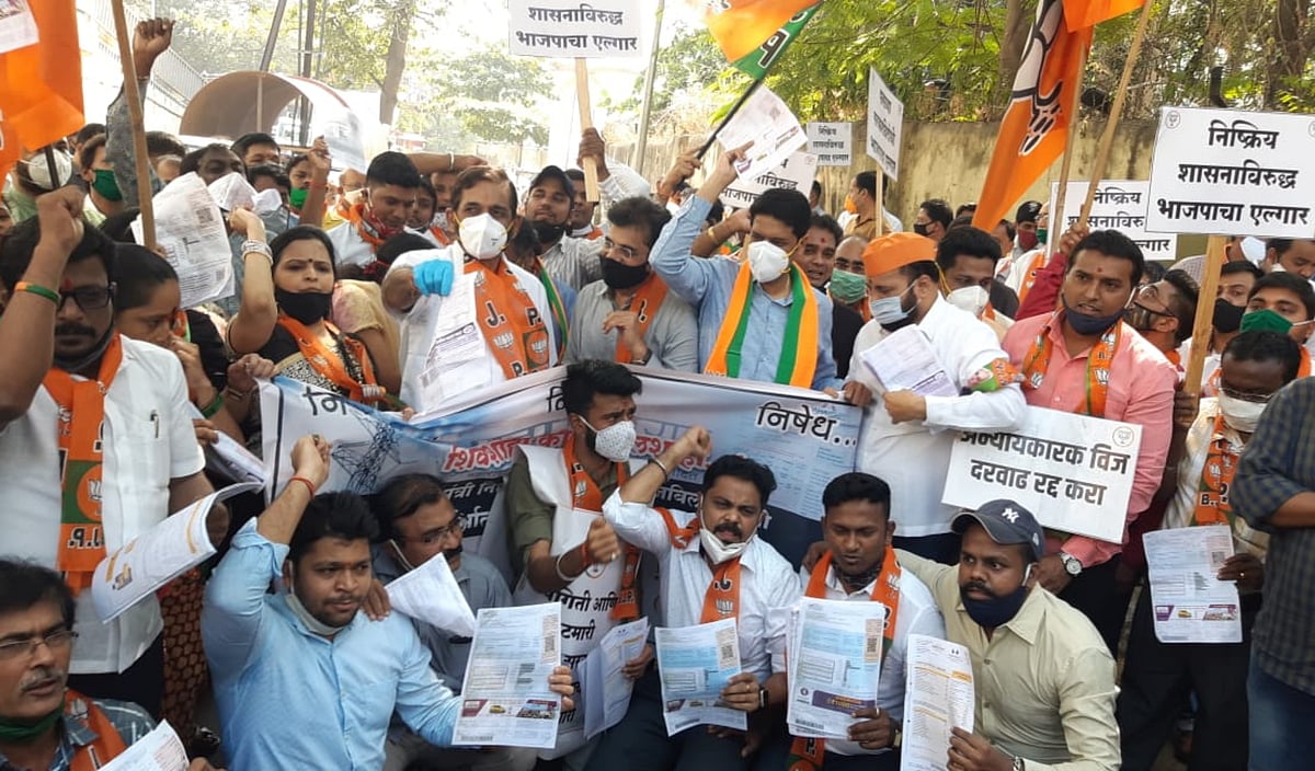 As the government denied to provide consession over the highly inflated bills issued by MSEDCL (MaharashtraStats Electricity Distribution Company Limited), the protest headed by BJP MLAs and MP was held in front of the electricity office at Thane, on Monday.