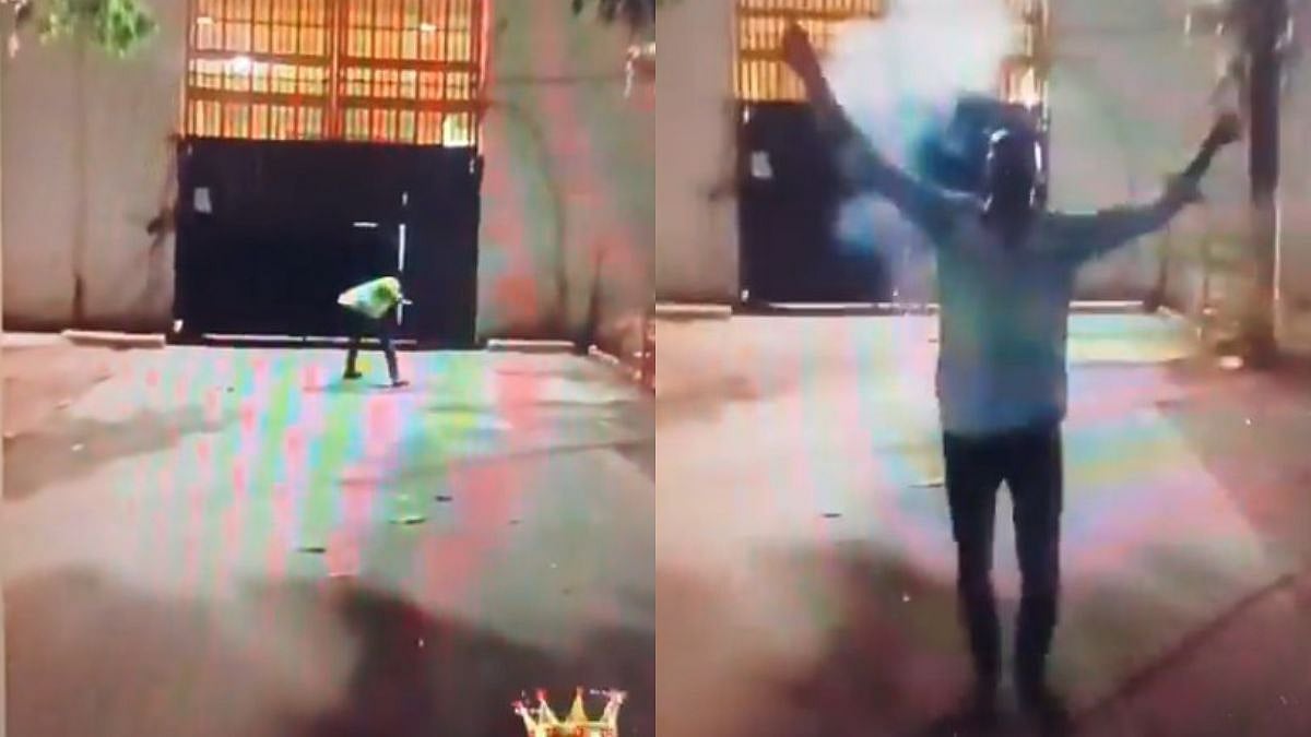 In the viral footage, a young man can be seen approaching the entrance of Aadharwadi Jail and lighting a string of firecrackers close to the gate. Moments later, he is seen running back towards the road while the crackers explode behind him.