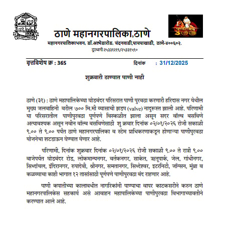 Thane: The Thane Municipal Corporation has announced a 12-hour complete shutdown of water supply on Friday, January 2, in some areas of Ghodbunder Road and several other adjoining areas in the city. The water supply will be affected as the 700 mm diameter valve on the main water supply pipeline at Haridas Nagar has developed a major technical fault.