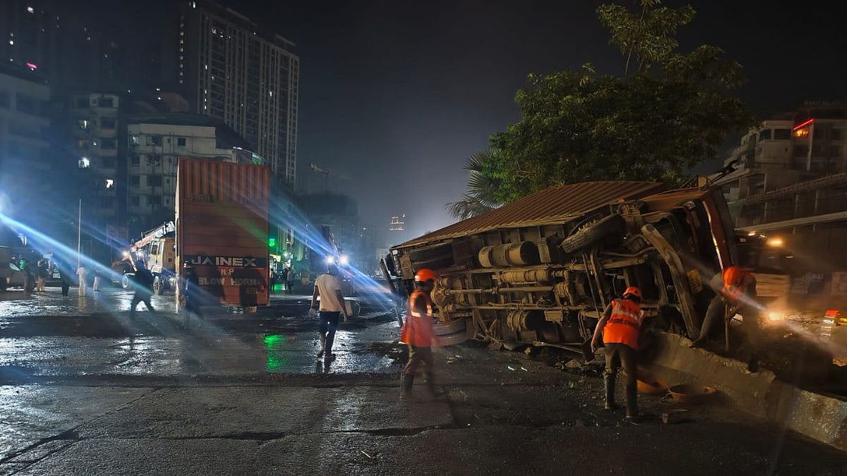 Thane, April 28: A late-night collision between two heavy vehicles near Bholenath Nagar, Shilphata, triggered a major cleanup operation and slowed traffic on the busy Thane-Shilphata lane early Tuesday morning.