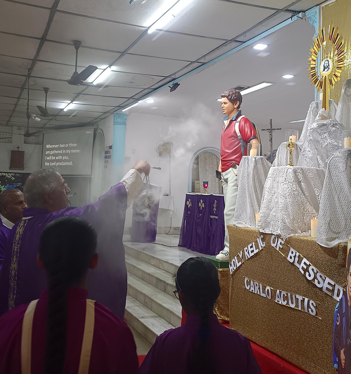 The relic will arrive at the Thane church at in the evening when the faithful will gather for a special religious service, or mass. An exhibition on Carlo's life will be on display in the church's auditorium.