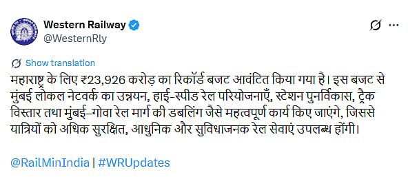 Mumbai: Union Railway Budget for 2026–27 has approved an allocation of Rs 23,926 crore for Maharashtra and the rail corridors connected to the state, according to a post on X by Western Railway.