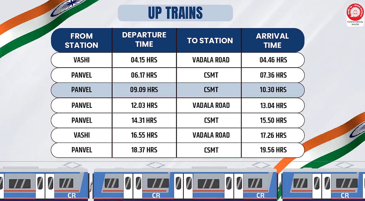 According to Central Railway, the new services will include seven ‘Up’ trains heading towards CSMT/Wadala Road and seven ‘Down’ trains running towards Panvel/Vashi. The first Up AC local will depart from Vashi at 4:15 am and reach Wadala Road at 4:46 am, while the last Up service will leave Panvel at 6:37 pm and arrive at CSMT at 7:55 pm. On the Down route, the first train will depart from Wadala Road at 5:06 am and reach Panvel at 6:08 am, with the last service leaving CSMT at 8:00 pm and arriving in Panvel at 9:21 pm.