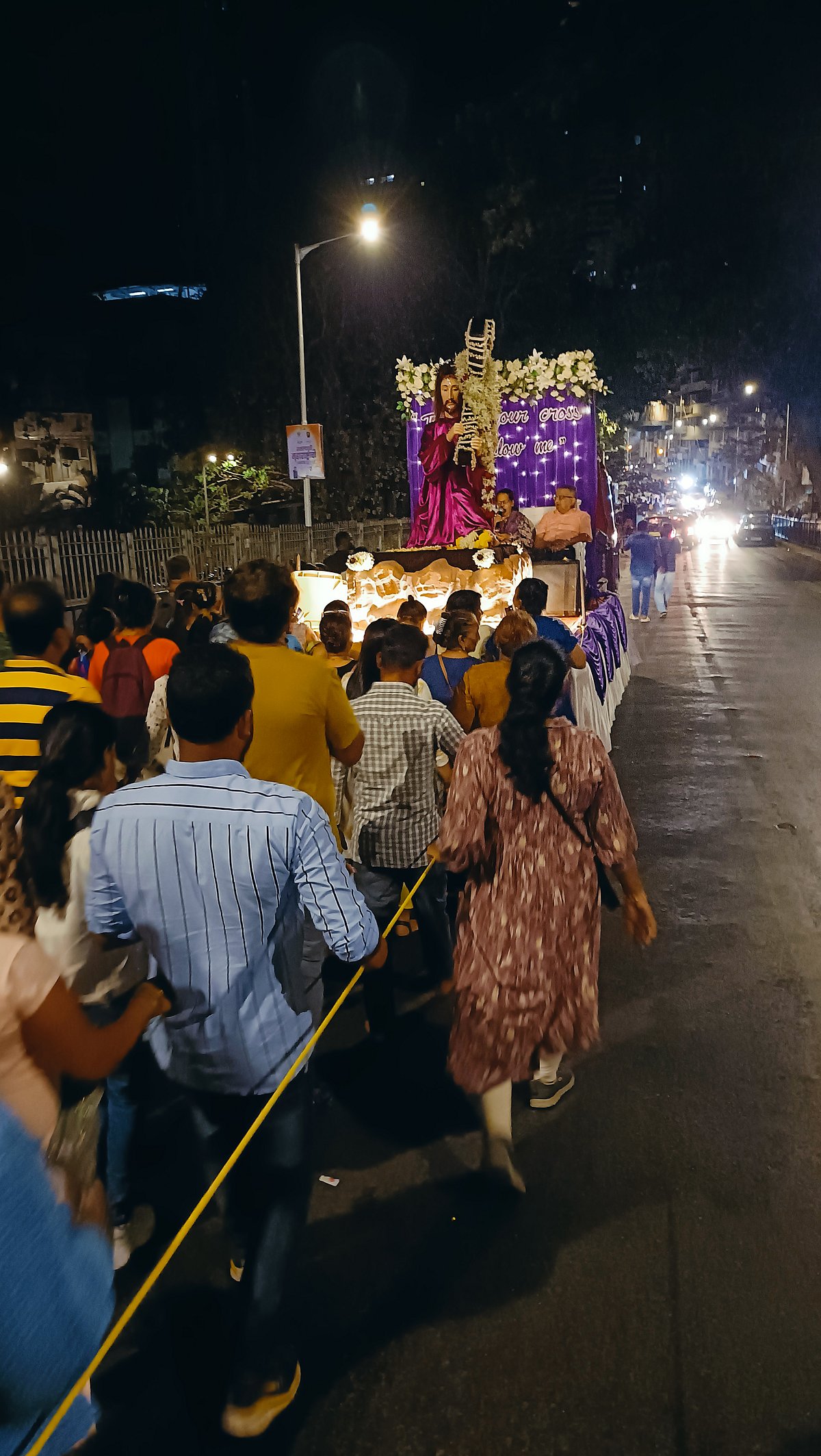 The processions included four beautifully-decorated floats, which depicted Mother Mary with angels around her, Jesus carrying the cross, "sorrowful mother" and St Joseph. A 17-feet heavy cross was also carried by the pilgrims up till Our Lady of Salvation Church, Dadar. All along the route and through the night, pilgrims sang hymns, and prayed the 'Rosary', 'Station of the Cross' and 'Divine Mercy' in various languages.