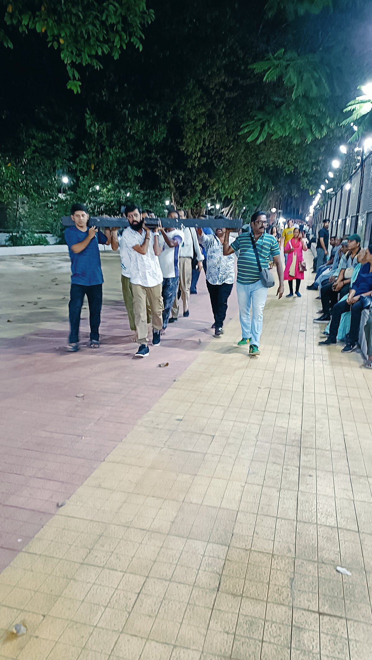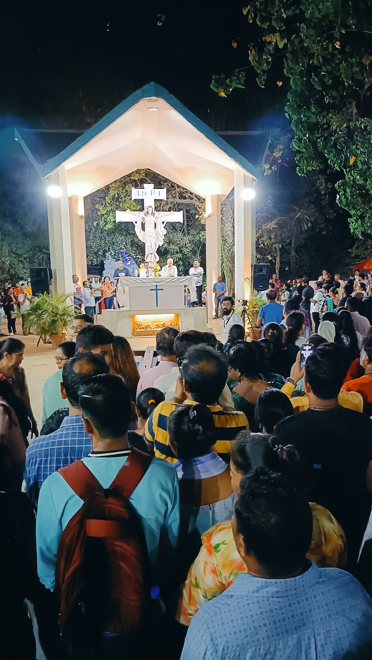 People of different religions volunteered to serve water and juices along the way. Many priests and sisters, too, joined in as pilgrims. People also were spotted reading ‘Station of the Cross’ with the help of mobile phone torchlights.