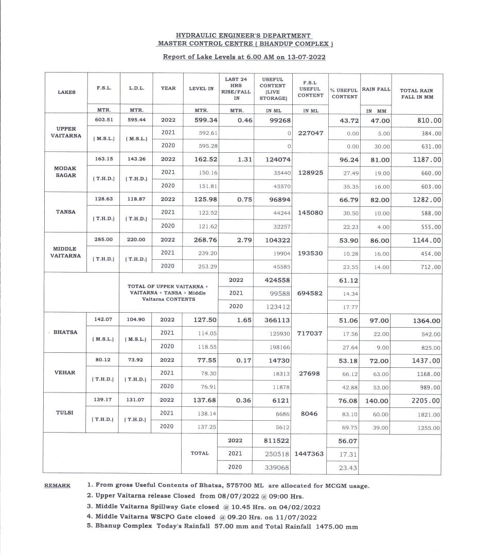 Modak Sagar is located outside Mumbai and supplies 450 million litres to the city per day. This lake has a useful content of 1,28,925 million litres. Last year it started overflowing at 3.24 am on July 22, and on August 18 in 2020. As for the percentage of water supplied by the seven lakes, the maximum comes from Bhatsa (48 per cent), Upper Vaitarna (16 per cent), Middle Vaitarna (12 per cent), Modak Sagar (11 per cent), and Tansa (10 per cent). The Tulsi and Vihar lakes, located in the city, supply 1-2 per cent of drinking water.