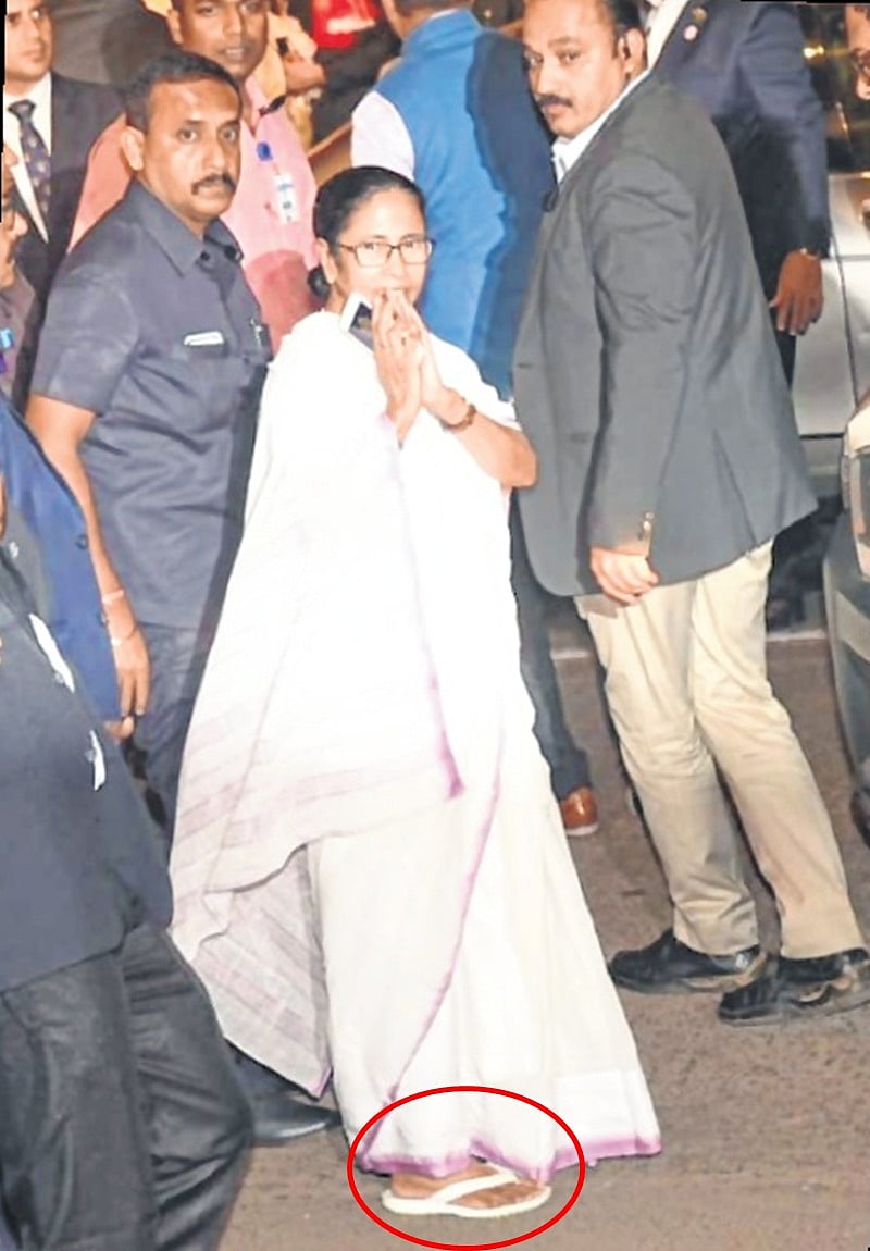 No man is an island, according to the English poet and cleric John Donne, but he did not quite reckon with the likes of our Mamata, who stood out as herself, among the well-heeled, in her ‘homespun’, traditional Mamata saree in subdued shades and her aam sandals. And she breezed in with her characteristic gait – the slippers going flip-flop – and drifted out with the same consummate ease. Pranaam.