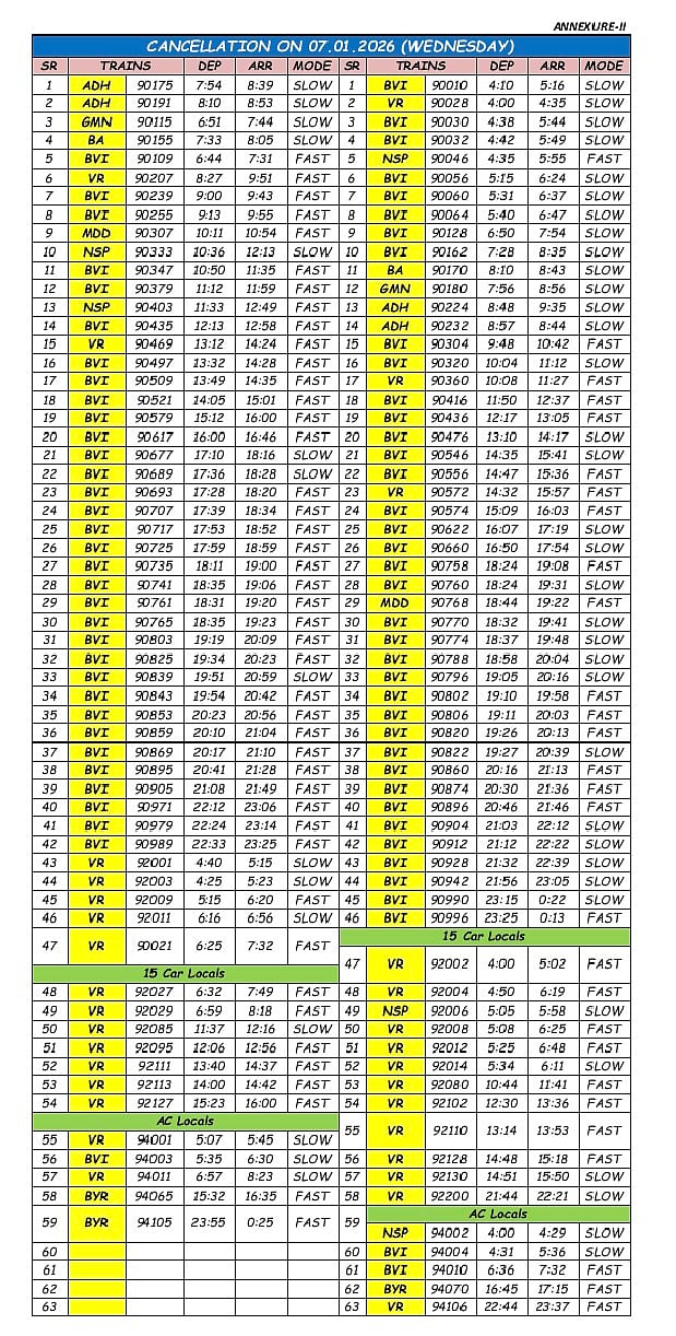 Due to this ongoing block, nearly 93 suburban trains on Western Railway will remain cancelled on 6th January, 2026, while around 122 suburban services will be cancelled on 7th January, 2026.
