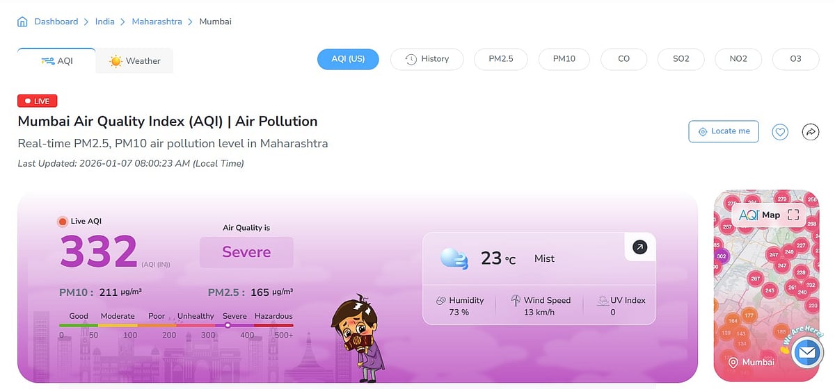 The video has resonated widely as it comes against the backdrop of worsening air quality in Mumbai. According to data from air quality monitoring platform AQI.in, the city’s overall Air Quality Index touched 332 during the early morning hours of January 7, placing it in the ‘severe’ category. Health advisories urged vulnerable groups, including children, senior citizens, and people with respiratory or cardiac conditions, to avoid prolonged outdoor exposure.