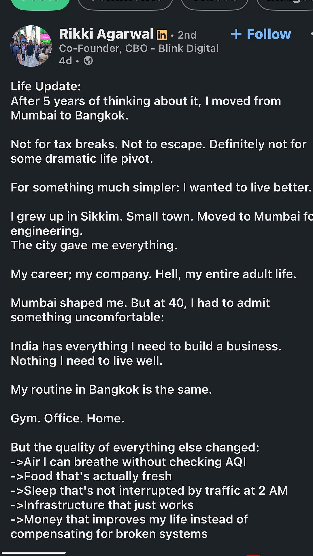 A candid LinkedIn post by Blink Digital co founder and Chief Business Officer Rikki Agarwal has gone viral after he announced that he recently moved out of Mumbai and relocated to Bangkok for a better quality of life. His honest reflection has triggered conversations among young Indian professionals who say they increasingly feel torn between opportunity and personal wellbeing in India’s biggest metros.