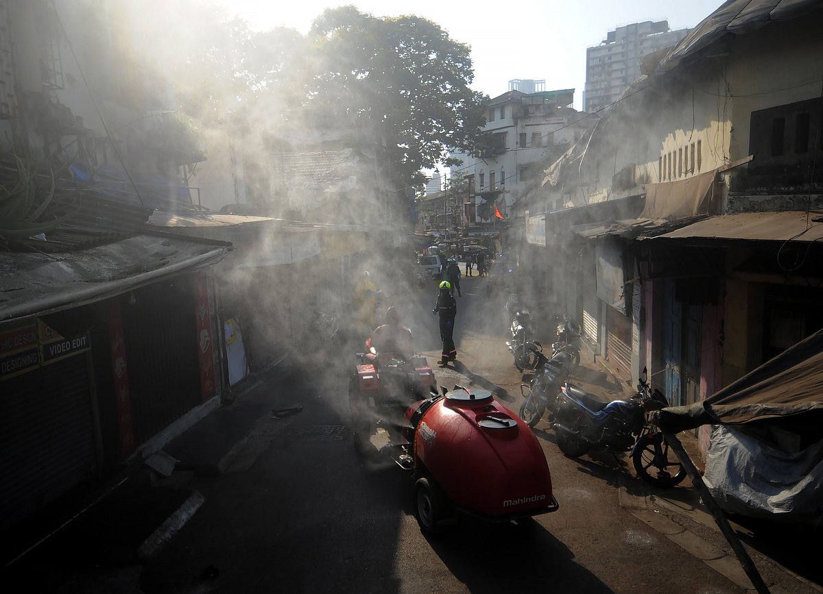 A man painting coronvirus' painting below Grant Road skywalk. | Photo by Bhushan Koyande