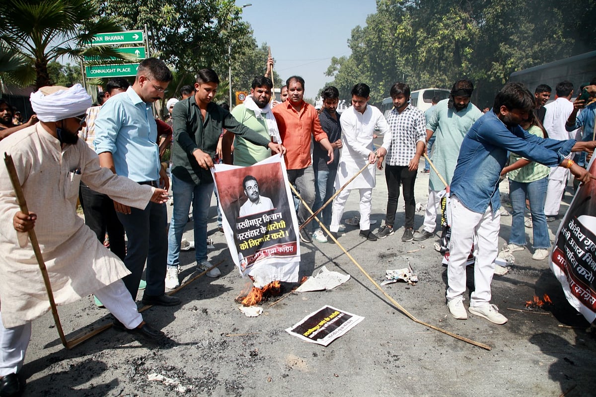 Workers of the Indian Youth Congress staged a protest in Delhi over Lakhimpur Kheri violence, in which eight people were killed, on Saturday.