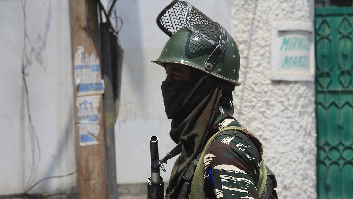 Securitymen stand guard outside Mirwaiz Manzil during strict restrictions imposed in downtown, Srinagar on the death anniversaries of two senior separatist leaders, Mirwaiz Moulvi Farooq and Abdul Ghani Lone on May 21, 2021. | Photo by Sajad Hameed