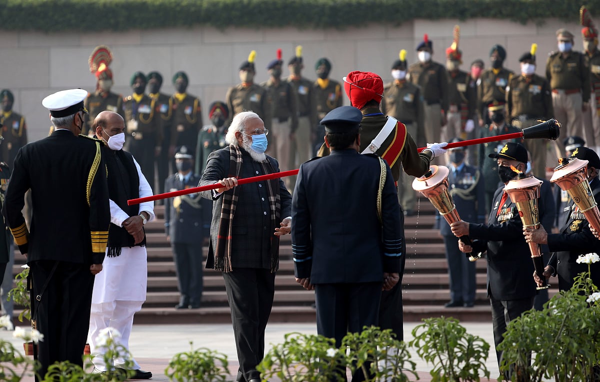 Prime Minister Narendra Modi on Wednesday lit the 'Swarnim Vijay Mashaal' from the eternal flame of the National War Memorial in New Delhi, marking the beginning of the 50th anniversary year celebrations of India's victory over Pakistan in 1971.