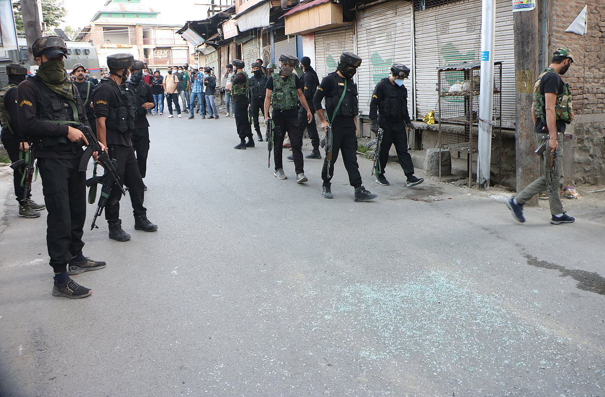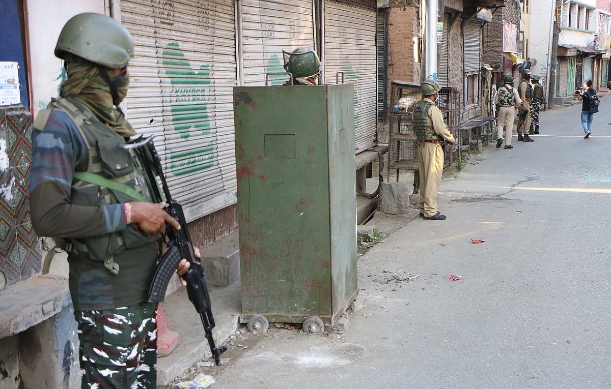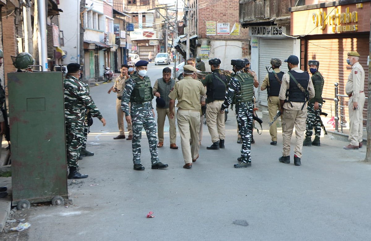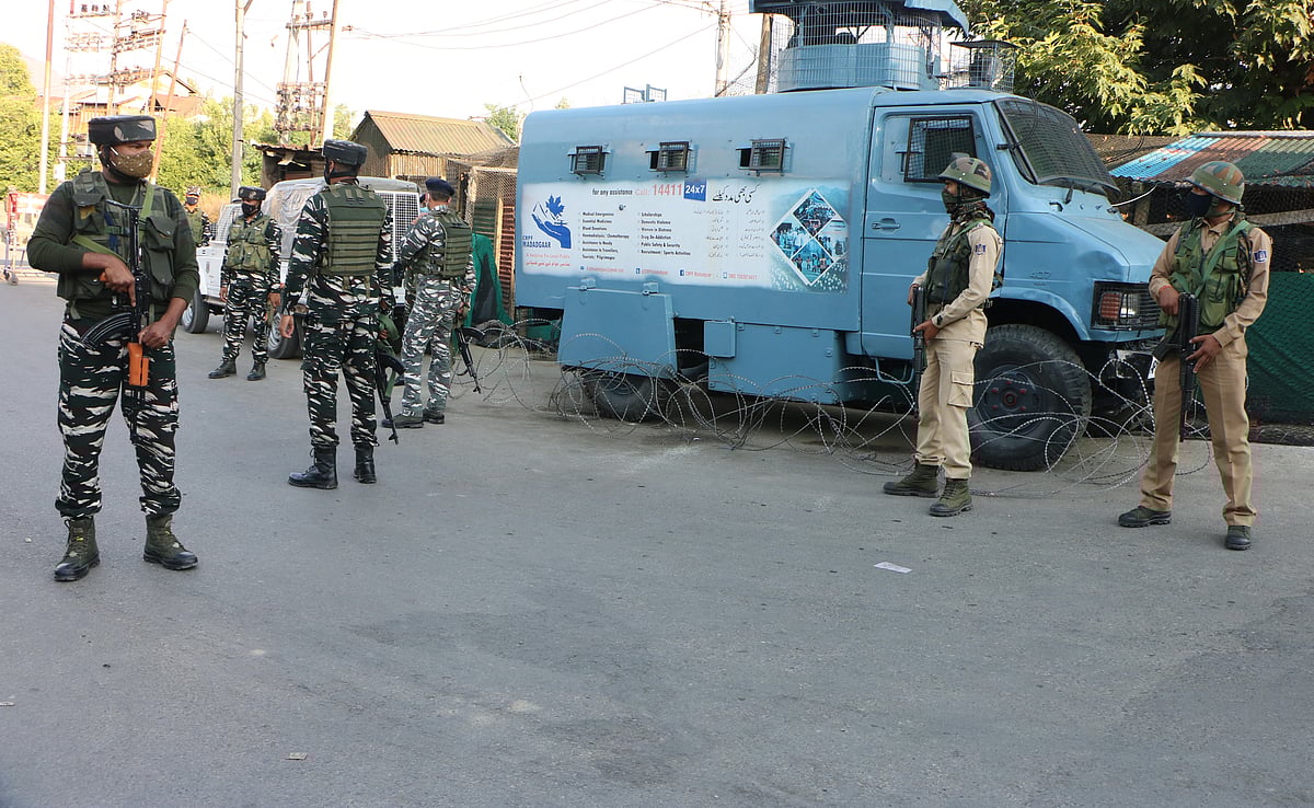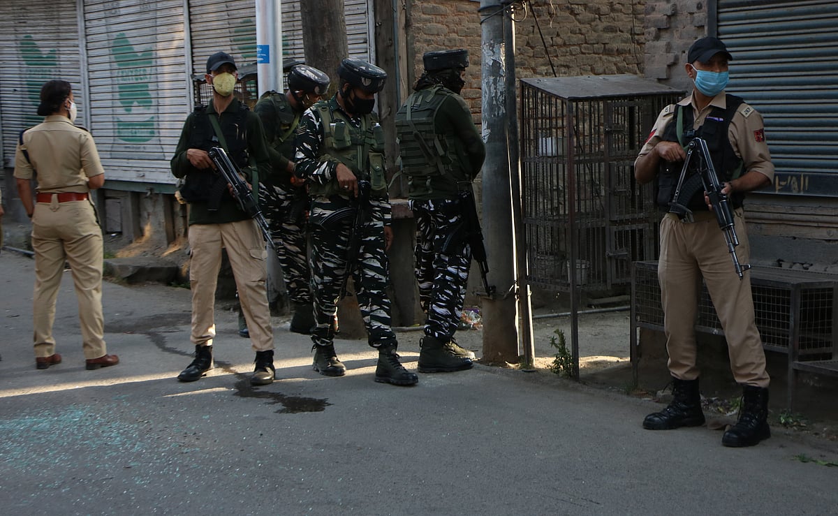 Government forces stand alert near the site, after a grenade attack by suspected militants on June 26, 2021, in Srinagar.