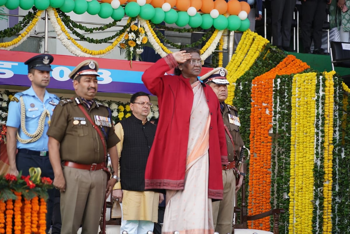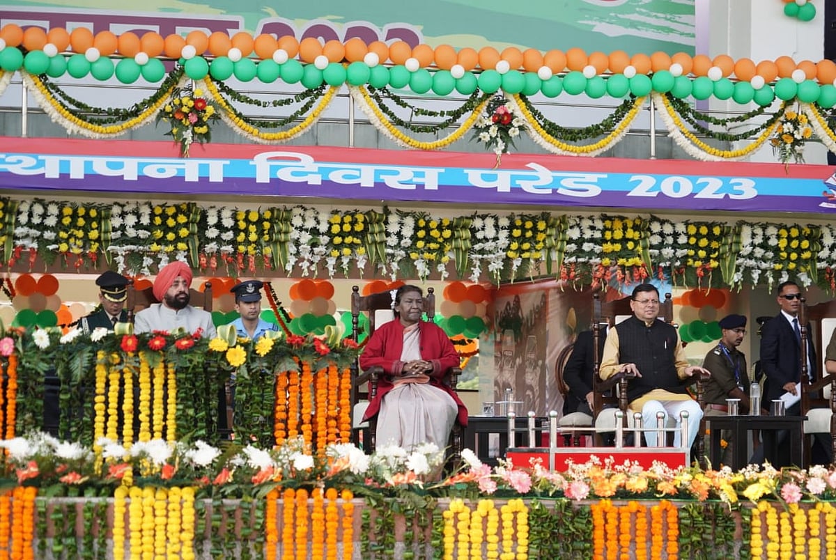 On the occasion of the program organized at Police Line, Dehradun on the occasion of State Foundation Day of Uttarakhand, President Smt. Droupadi Murmu congratulated all the people of Uttarakhand. In her address, President Smt. Droupadi Murmu said that after the formation of the state, with the new identity, the hardworking people of Uttarakhand have set their foot on new heights of development and progress . The tradition of calling the sacred Uttarakhand as 'Dev-Bhoomi' due to the blessings of Lord Shiva and Lord Vishnu is revered. This sacred land, which receives energy from Goddess Parvati, daughter of the mountain king Himalaya and other worshipable forms of Shakti and is irrigated with the love of river mothers like Ganga and Yamuna, is also 'Goddess-land'. This area resounds with the sacred chants of ‘Jai Maha-Kali’ and ‘Jai Badri-Vishal’. The sounds of Gurbani emanating from Hemkunt Sahib and Nanak-Matta make the atmosphere here pure. The President said that in the month of December last year, I had the opportunity to visit Uttarakhand. Every opportunity of coming to Uttarakhand is like gaining the virtue of pilgrimage. From this Devbhoomi of Uttarakhand, I express advance wishes of Diwali to all the countrymen and pray to Goddess Lakshmi to fill the entire India including Uttarakhand with wealth, happiness and health.