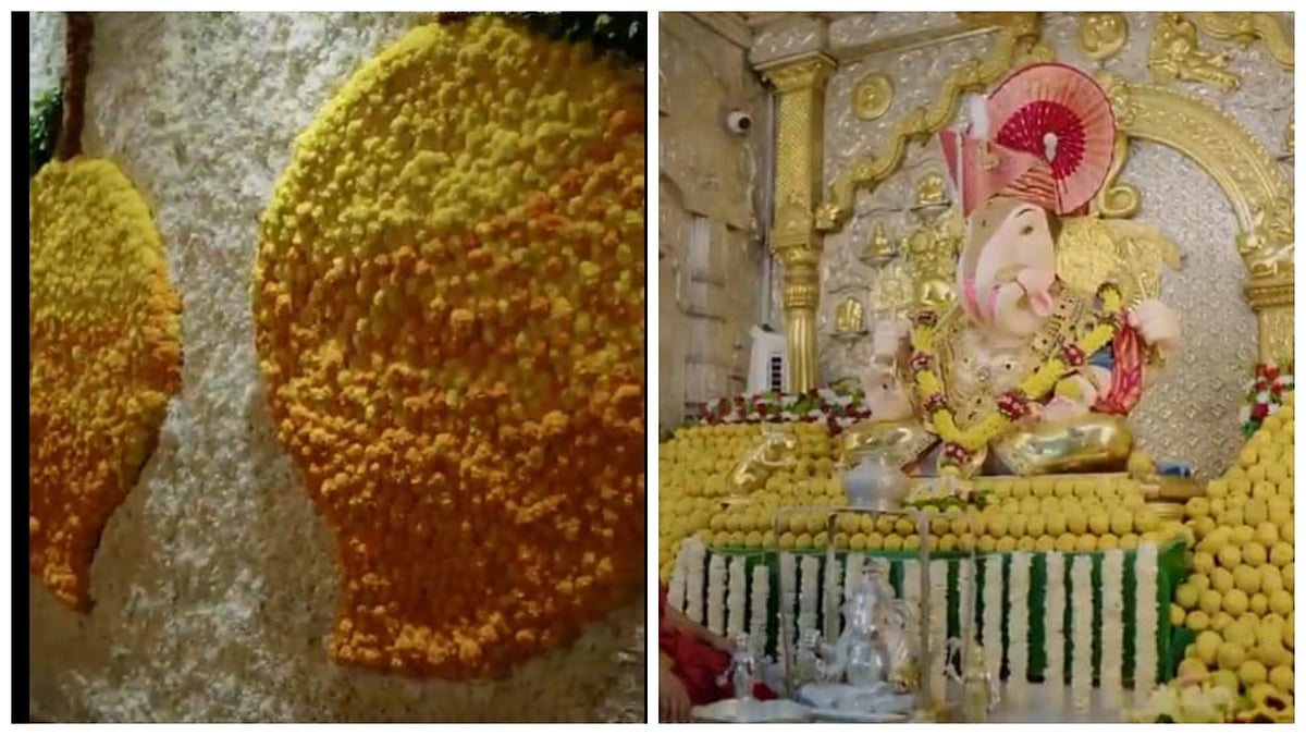 Inside the temple, Lord Ganpati (Bappa) was seen surrounded by neatly arranged mangoes placed all around the idol. The entire stage area in front of the idol was filled with rows of fresh mangoes, giving a bright yellow look. The idol was also adorned with a new traditional look, adding to the festive feel of the day.