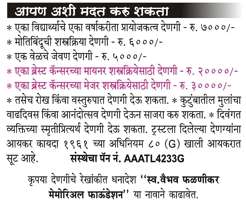 In February 2002, the couple started the ‘Late Vaibhav Phalnikar Memorial Foundation,’ a charitable trust, where Phalnikar serves as its founder and president, with Sadhana serving as a trustee.