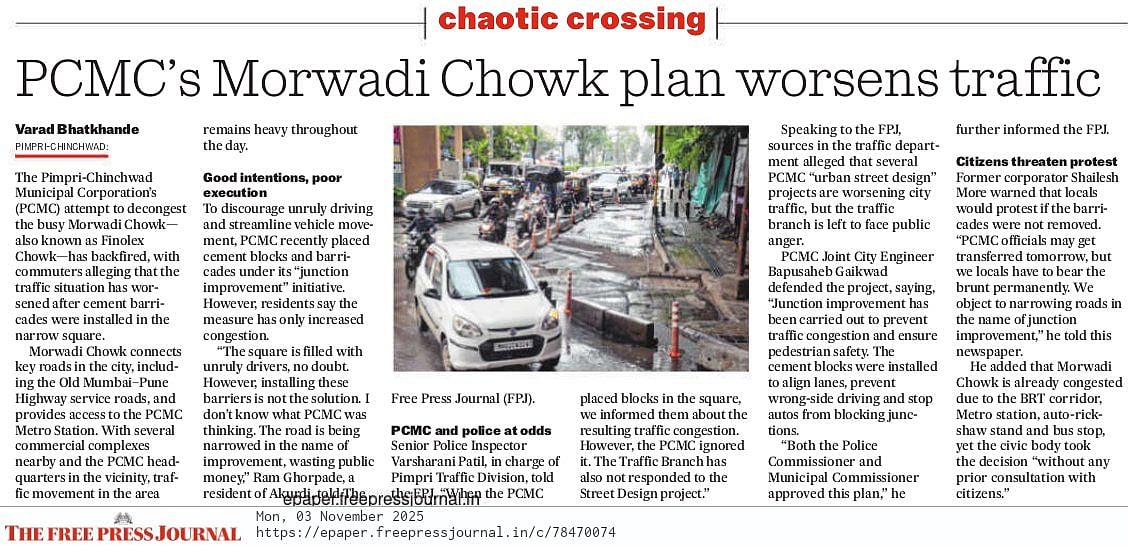 Work on a water pipeline is also underway on this same service road, which is part of the BRT route from Nigdi to Dapodi. As a result, PMPML buses are also running on the service road. The bus stop is on the road itself. Passengers also wait on the road for the bus. As a result, there has been severe traffic congestion in the Pimpri and Morwadi area for the past few months. The PCMC's experiment to improve the junction faced strong opposition from local politicians and commuters. Some organisations also staged protests. Finally, in view of the traffic congestion and the growing opposition, the PCMC administration claimed that the trial was complete and removed the poles and cement blocks. This has provided some relief to the drivers from the gridlock, but the traffic congestion exists.