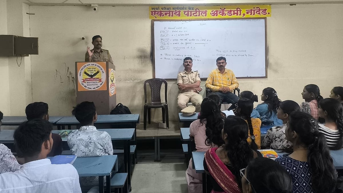 As part of the programme, on Oct 15, officers from the Cyber Police Station, including Assistant Police Inspector Dayanand Patil, PSI Maroti Chavan and Police Constable Kashinath Karkhede, visited Eknath Patil Academy in Nanded. They conducted an interactive session for students on cybercrime, drug abuse and its consequences, road safety, and protection of women and children.