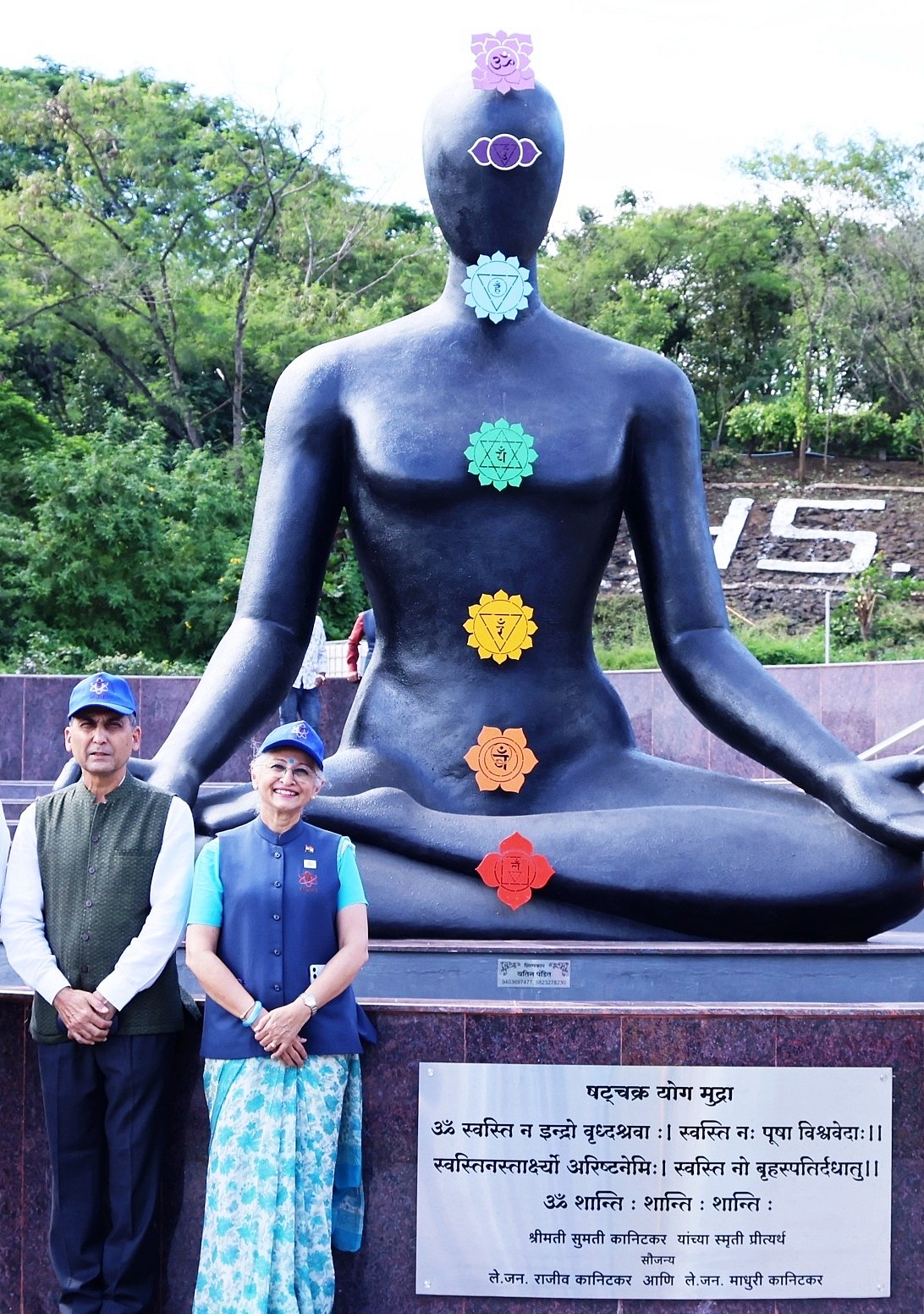 The 'Arogya Manav' initiative was recently inaugurated on the premises of Maharashtra University of Health Sciences in Nashik. For this project, Lt. Gen. Rajiv Kanitkar (Retd) and Vice Chancellor Lt. Gen. Madhuri Kanitkar (Retd) have donated Rs 10 lakhs to the university for the six-chakra yoga mudra erected in the memory of Mrs Sumati Kanitkar.