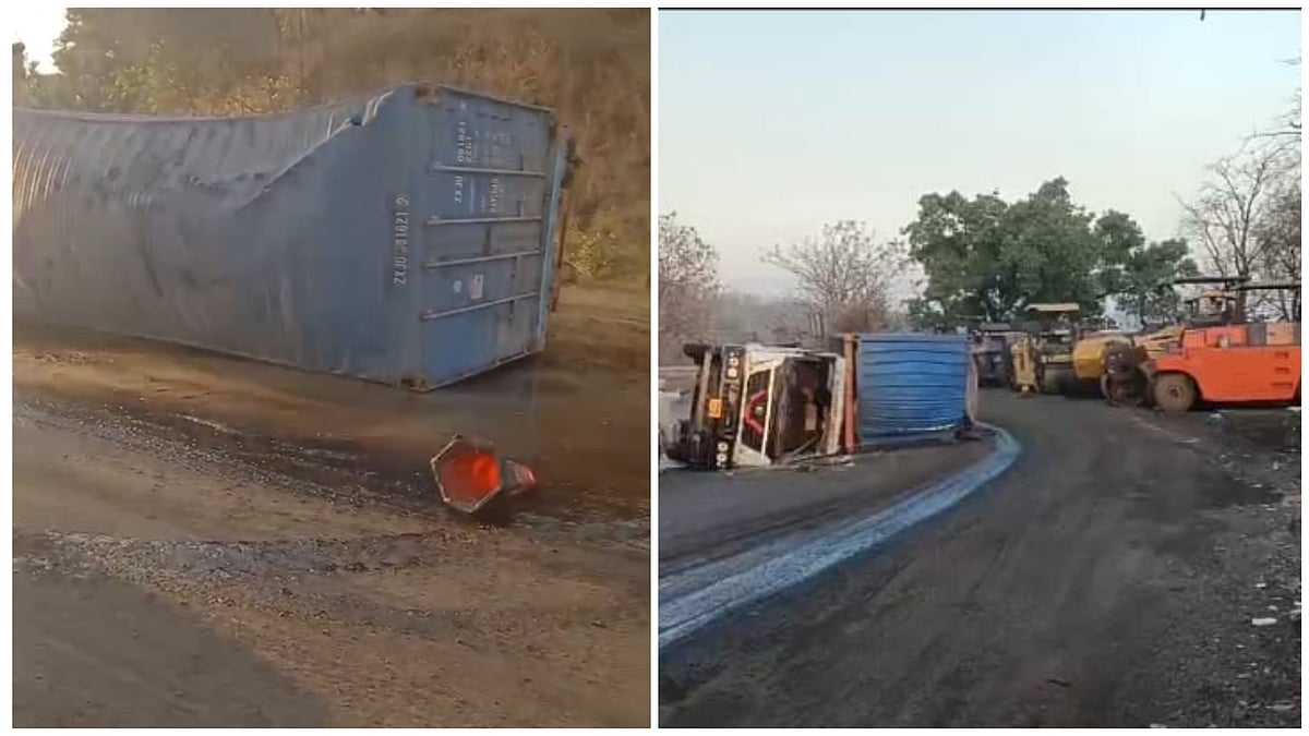 Nashik: A container truck met with an accident today near Top Barav in the old Kasara Ghat section of the Mumbai-Nashik Highway. The container, loaded with chocolate oil, overturned on the road. Two individuals sustained injuries in the accident, and traffic was completely disrupted for some time as the oil spilt across a 500-meter stretch of the roadway.