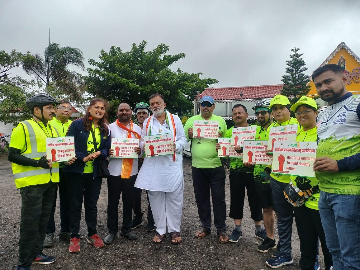 After paying tributes to the statue of Chhatrapati Shivaji Maharaj at Nashik Road, they proceeded to Sinnar. Here, they were welcomed, and tea was arranged by the Mitramela family. After crossing the Ghat of Sinnar, a grand welcome was given by the Sinnar Cyclist Group at Hotel Vithu Mauli. At the time, MP Rajabhau Waje was specially present to greet the cyclists. He wished everyone a safe cycle ride and appreciated the Nashik cyclists for organising this ride with a social message to make the country drug-free.