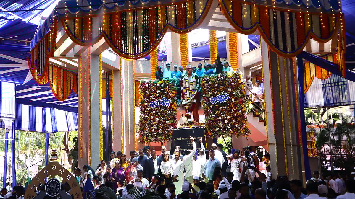 The venue was beautifully decorated with flowers, lights and colourful arrangements. The statue of Babasaheb stood at the centre, adorned with garlands, as people offered respects with folded hands. The grand decoration created a festive and respectful atmosphere, drawing large crowds throughout the day.