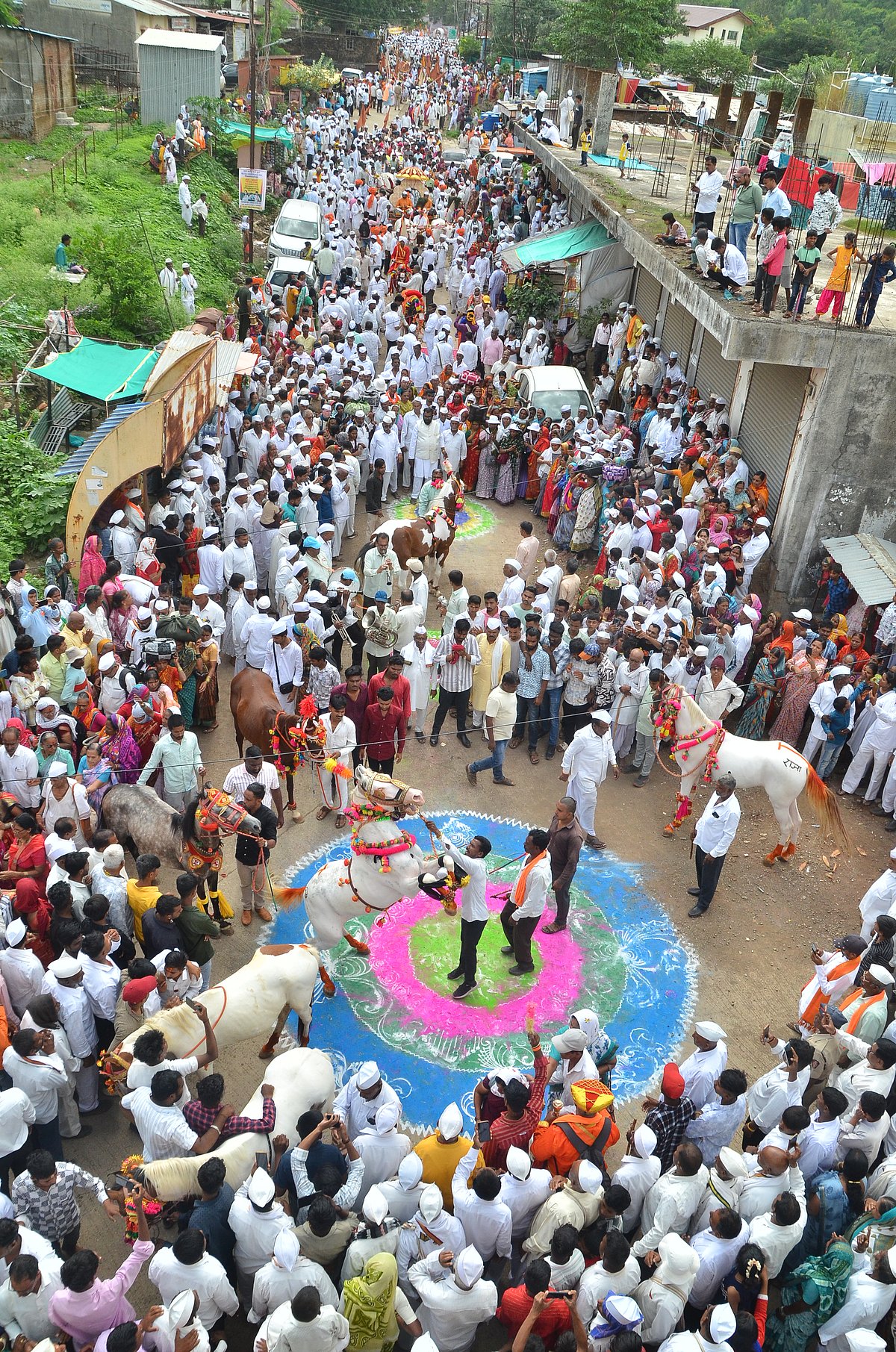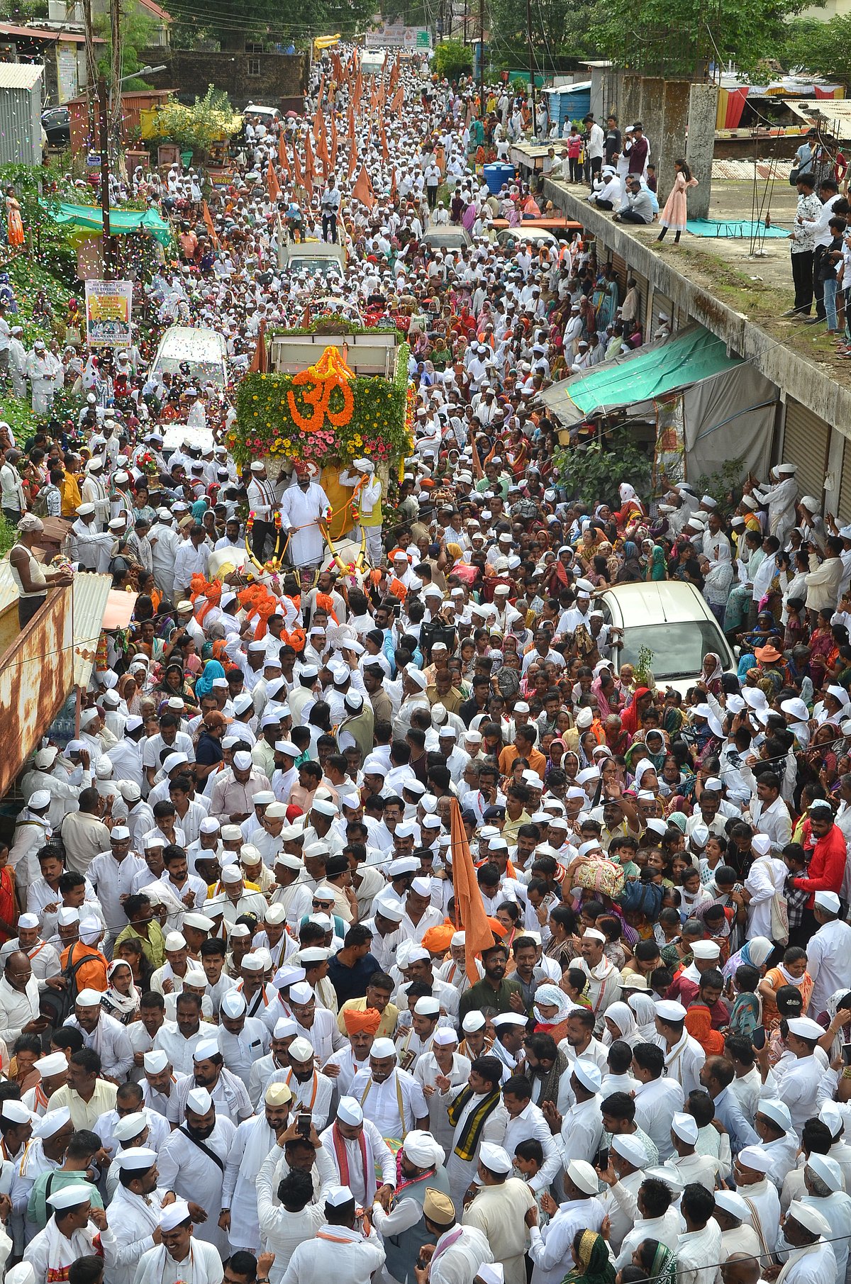 This year, three pairs of bullocks are being used for the chariot, and approximately 30,000 warkaris are accompanying the palkhi.